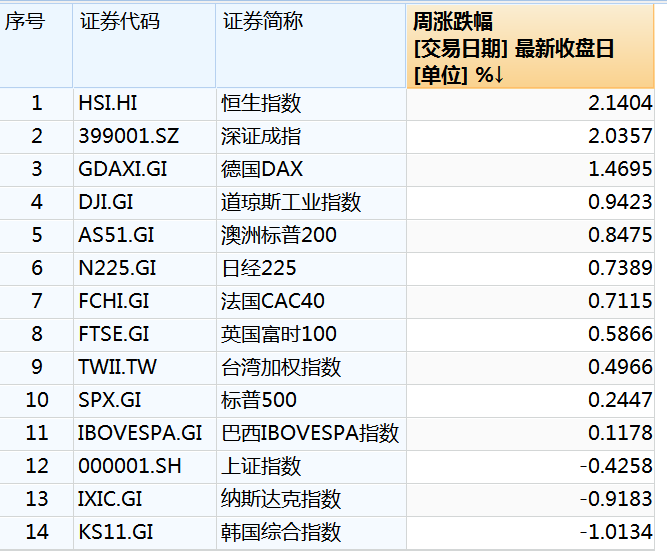 上周全球重要股票指数涨跌幅