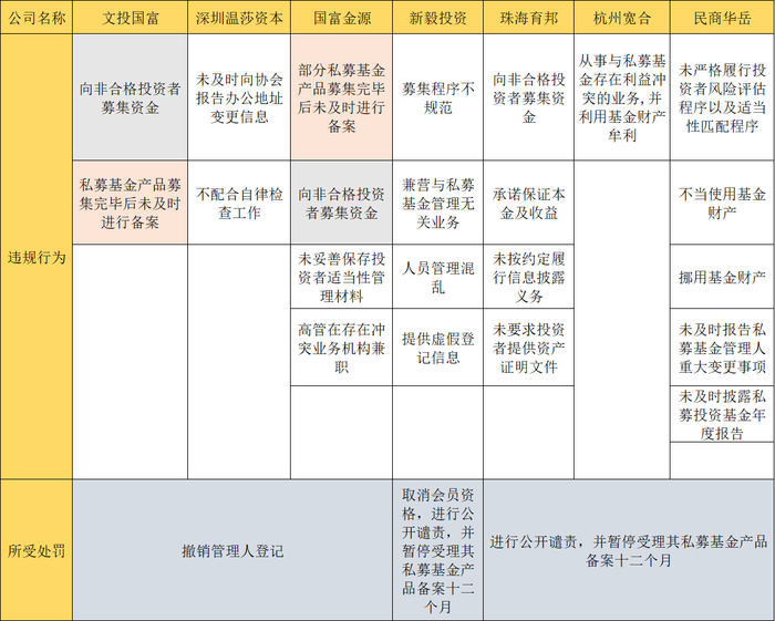 在被撤销管理人登记的私募中,文投国富和国富金源都存在向非合格投资者募集资金、私募基金产品募集完毕后未及时进行备案的违规行为;深圳温莎资本的违规行为则是未及时向协会报告办公地址变更信息、不配合自律检查工作。