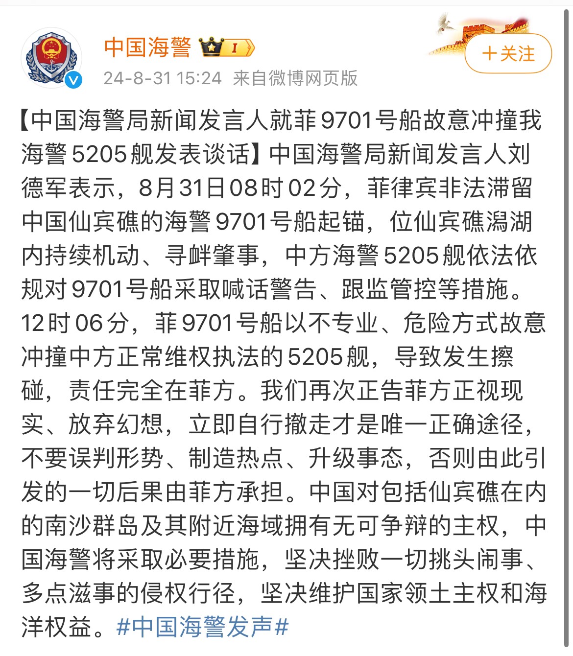 据中国海警官微消息,中国海警局新闻发言人刘德军表示,8月31日08时02分,菲律宾非法滞留中国仙宾礁的海警9701号船起锚,位仙宾礁潟湖内持续机动、寻衅肇事,中方海警5205舰依法依规对9701号船采取喊话警告、跟监管控等措施。12时06分,菲9701号船以不专业、危险方式故意冲撞中方正常维权执法的5205舰,导致发生擦碰,责任完全在菲方。我们再次正告菲方正视现实、放弃幻想,立即自行撤走才是唯一正确途径,不要误判形势、制造热点、升级事态,否则由此引发的一切后果由菲方承担。中国对包括仙宾礁在内的南沙群岛及其附近海域拥有无可争辩的主权,中国海警将采取必要措施,坚决挫败一切挑头闹事、多点滋事的侵权行径,坚决维护国家领土主权和海洋权益。
