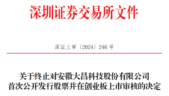 日前,大昌科技向深交所提交了《安徽大昌科技股份有限公司关于撤回首次公开发行股票并在创业板上市申请文件的申请》,保荐人向深交所提交了《国元证券股份有限公司关于撤回安徽大昌科技股份有限公司首次公开发行股票并在创业板上市申请文件的申请》。根据《深圳证券交易所股票发行上市审核规则(2024年修订)》第六十二条的有关规定,深交所决定终止对大昌科技首次公开发行股票并在创业板上市的审核。