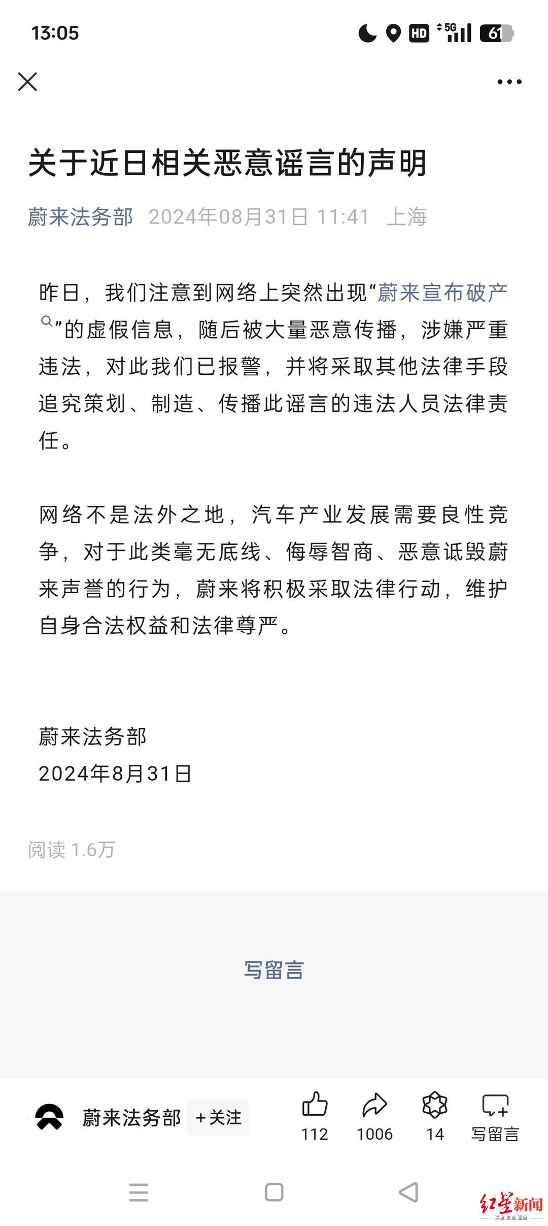红星资本局8月31日消息,今日,蔚来(09866.HK/NIO.US)法务部微信公众号发布《关于近日相关恶意谣言的声明》,称昨日网络上突然出现“蔚来宣布破产”的虚假信息,随后被大量恶意传播,涉嫌严重违法,对此蔚来已报警,并将采取其他法律手段追究策划、制造、传播此谣言的违法人员法律责任。