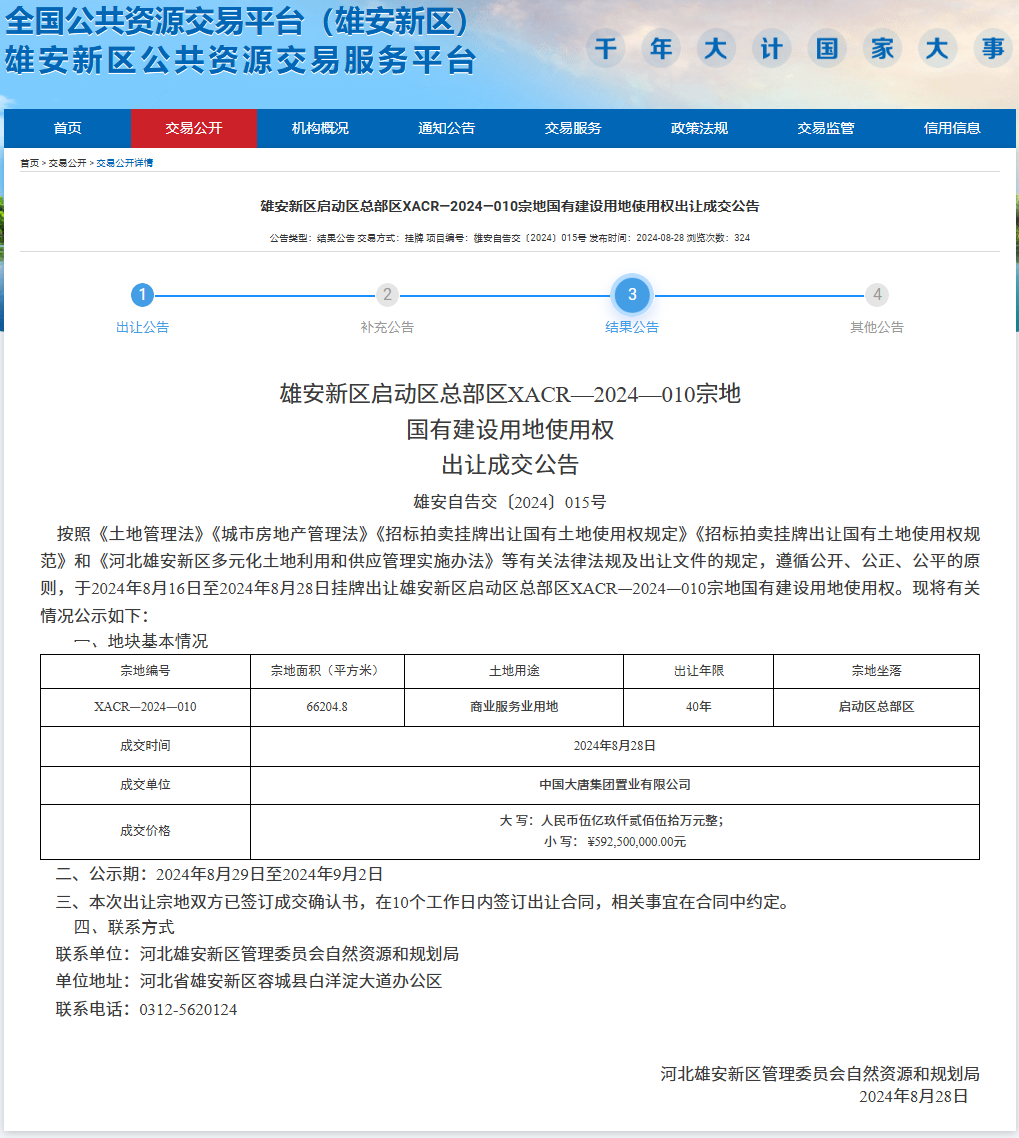 据雄安新区公共资源交易服务平台8月28日公告显示,中国大唐集团置业有限公司以592,500,000元竞得雄安新区启动区总部区XACR—2024—010宗地国有建设用地使用权。