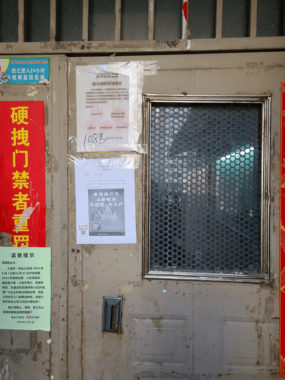 事发小区楼门口张贴的提示,“电动自行车和蓄电池不进楼不入户”