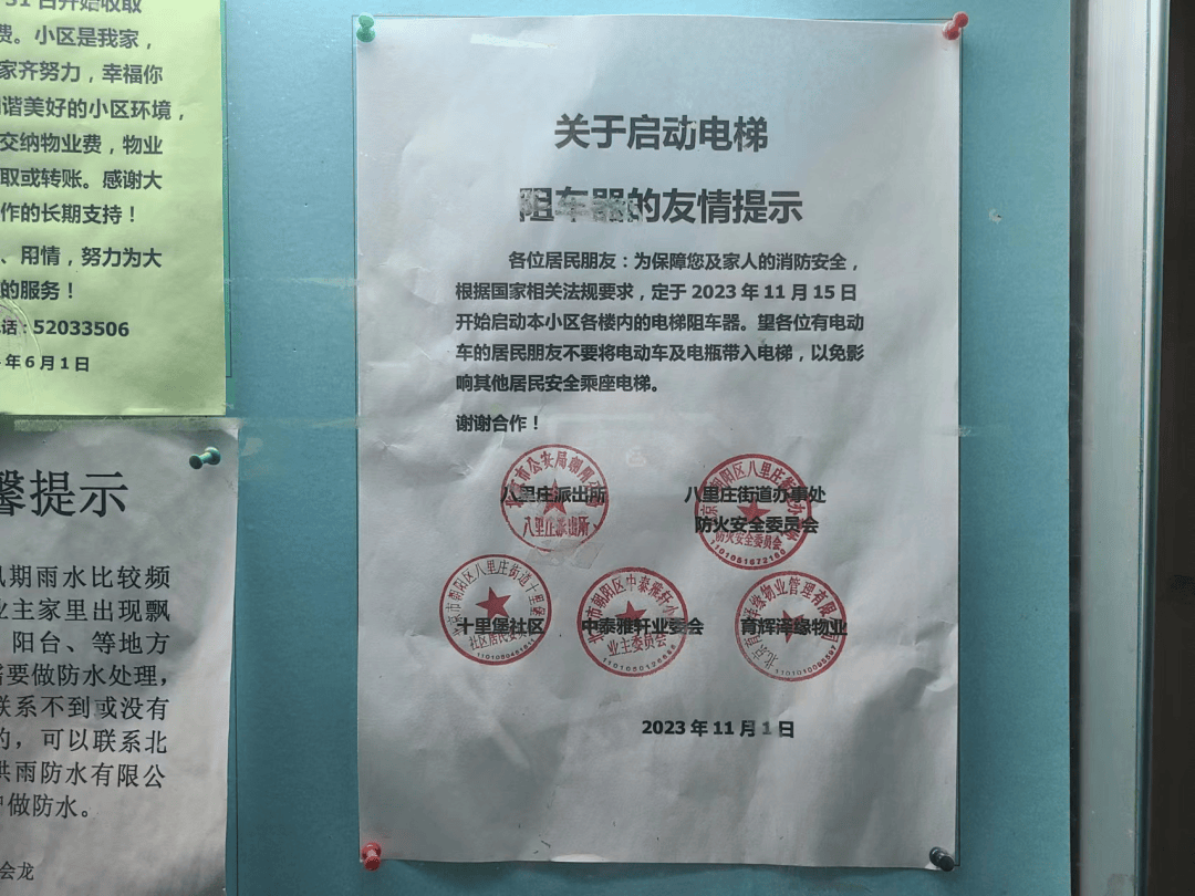 8月29日中午,记者前往事发小区了解情况,看到居民楼门前、电梯内外四处张贴着“禁止电动自行车和蓄电池进楼入户”的宣传语,十分显眼,还有请居民相互监督的提示牌。