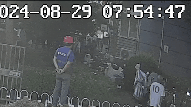 老人被推倒地瞬间动图(男子推倒陈大爷,陈大爷身高比较高,身着深蓝色上衣。)