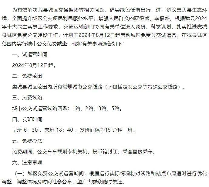 潇湘晨报记者注意到,8月11日,虞城县交通运输局发布公告:根据该县2024年十大民生实事工作要求,计划于8月12日起启动城区免费公交试运营,在县城区范围内实行城市公交免费乘坐。免费期间,公交车车载刷卡机关机、投币箱封闭,乘客直接乘车。此举引发网友热议,大家纷纷点赞“一个县城能做到免费乘坐公交是一件了不起的事”“为虞城县点赞”“真的吗?难以置信”。