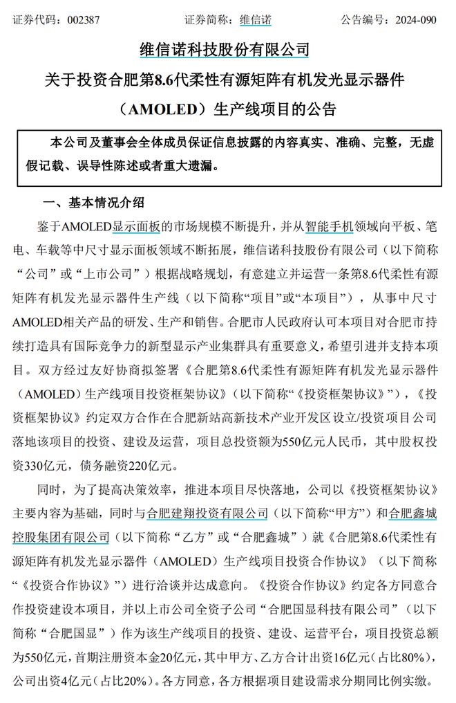 维信诺8月29日晚公告,经友好协商,公司和 合肥市政府拟签署《合肥第8.6代柔性有源矩阵有机发光显示器件(AMOLED)生产线项目投资框架协议》(以下简称《投资框架协议》)。