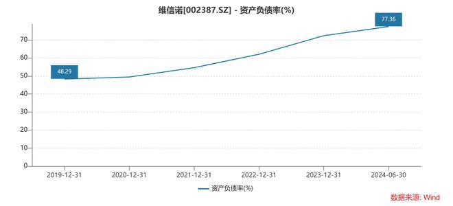 从资产负债率来看,近些年来,维信诺负债率持续上升,已从2019年的48.29%,飙升至2024年上半年的77.36%。