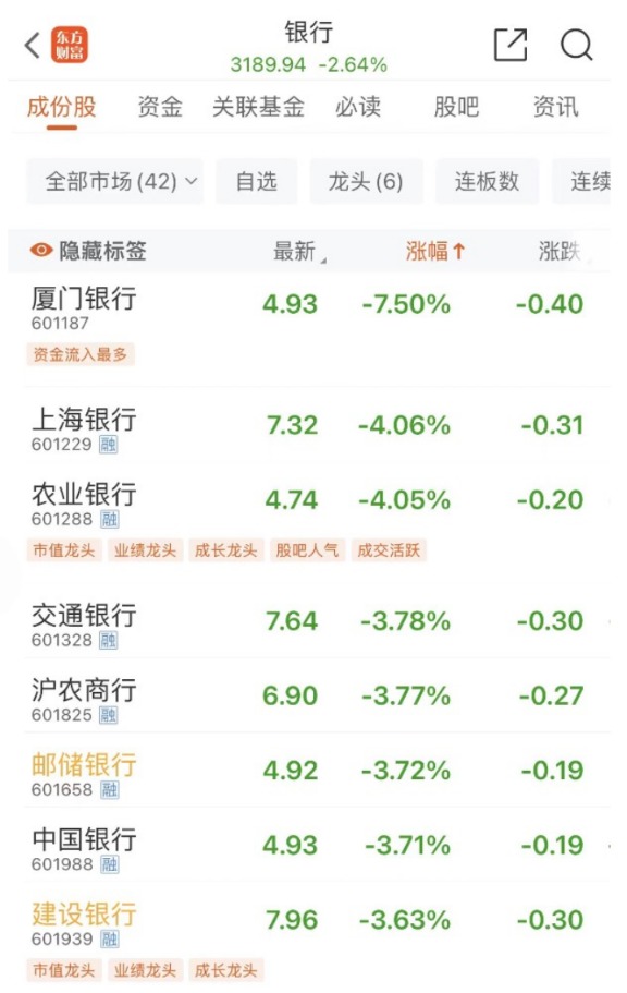 今天早盘,银行股集体杀跌。近期,被市场热议的六大行亦集体杀跌,普遍跌幅超过3%,其中农行跌超4%。