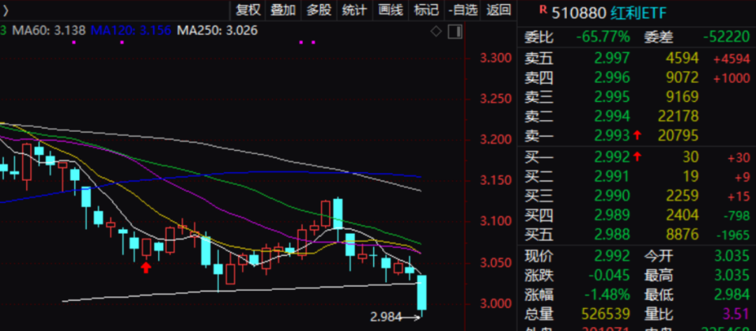 值得注意的是,今天还不止银行股杀跌,中字头个股多数亦大幅走弱。中国神华、中国石化、中国石油、中国核电、中国电建、中国交建、中国铁建、中国中冶等亦是全线杀跌。红利ETF更是出现了明显的破位走势。
