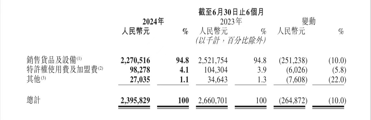 加盟商群体则为茶百道贡献了绝大部分的营收,是茶百道真正意义上的“客户”。财报显示,占比持续超九成的销售货品及设备业务,实现收入22.7亿元,同比下降10%;特许权使用费及加盟费0.98亿元,同比下降5.8%,占总收入比例4.1%;其他收入0.27亿元,同比下降22%,占总收入比例1.1%。