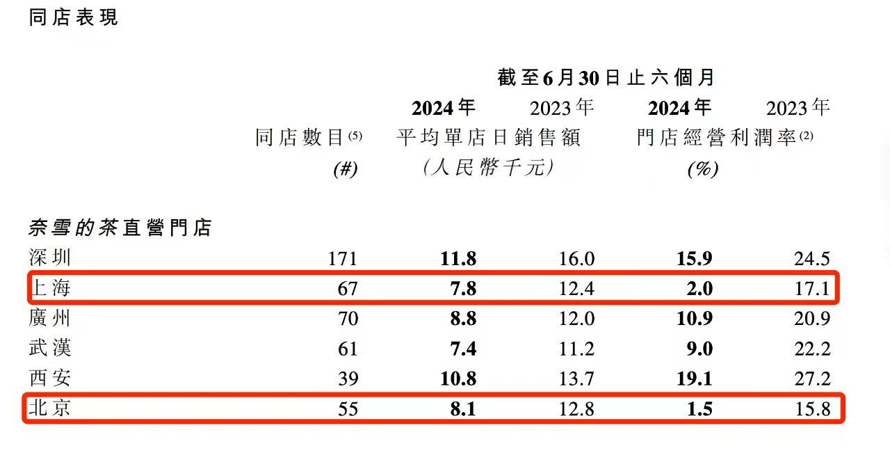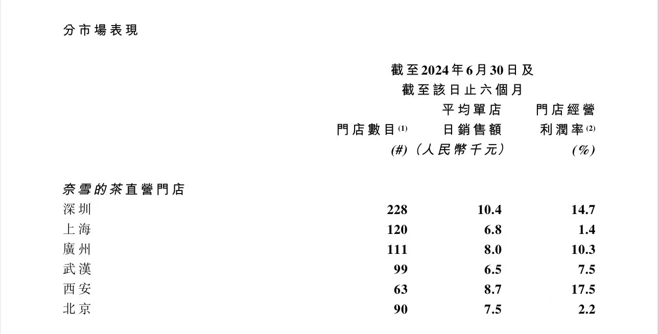 在门店盈利方面,奈雪的茶在北上广深、武汉和西安六个城市的门店经营利润率均有所下滑,其中上海和北京降幅最高,北京该指标从去年的15.8%降至1.5%;上海该指标从去年的17.1%降至2%。值得注意的是,上海直营门店数量仅次于深圳,位列第二,为228家。