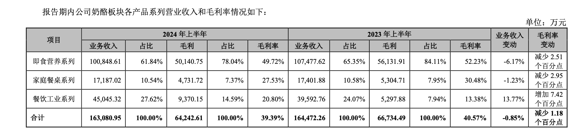 但这块业务毛利不高。财报显示,上半年,妙可蓝多即食营养系列毛利率为49.72%,家庭餐桌系列毛利率为27.53%,餐饮工业系列毛利率仅为20.80%。
