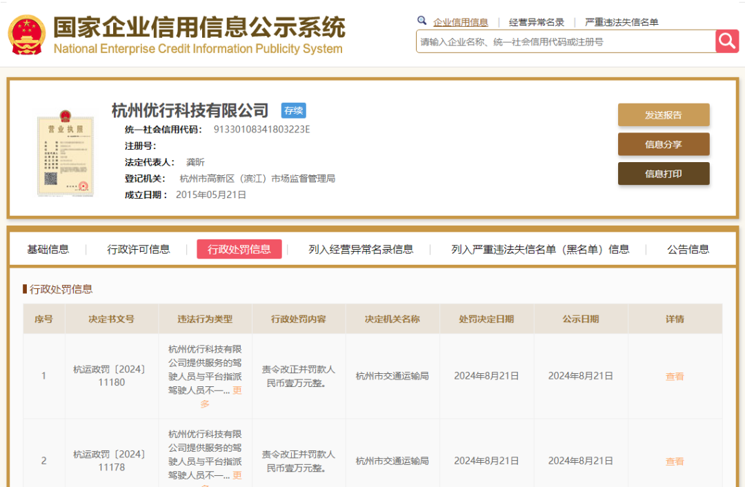 8月13日,行政处罚决定书杭运政罚﹝2024﹞10181号、09187号显示,杭州市交通运输局行政执法人员检查发现杭州优行科技有限公司提供服务的车辆未取得车辆营运证。