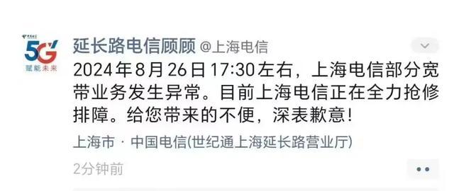 “2024年8月26日17:30左右,上海电信部分宽带业务发生异常。目前上海电信正在全力抢修排障。给您带来的不便,深表歉意!”