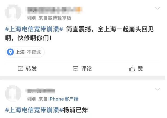 今天(26日)傍晚,大批网友反映上海电信宽带无法使用,相关话题#电信断网#火速冲上热搜。不少网友在社交平台上反映“电信断网”“上海电信崩了”。
