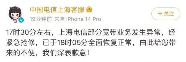 19时35分,中国电信上海客服发布微博称:17时30分左右,上海电信部分宽带业务发生异常,经紧急抢修,已于18时05分全面恢复正常,由此给您带来的不便,我们深表歉意!