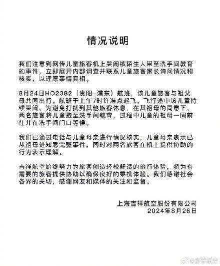 26日晚,吉祥航空就网传“儿童旅客机上哭闹被陌生人带至洗手间教育”,发布情况说明: