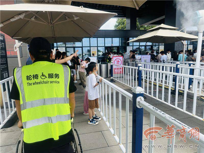 进了第一道门,过安检、刷身份证即可。入场后,不少游客排队坐电瓶车,工作人员说:“电瓶车只能坐到门口,一人五元,推轮椅直接就进了,不用排队坐电瓶车,轮椅坐电瓶车不方便,走过去更快。”在此过程中,记者看到,园区内也有轮椅服务人员推着轮椅招揽游客乘坐。