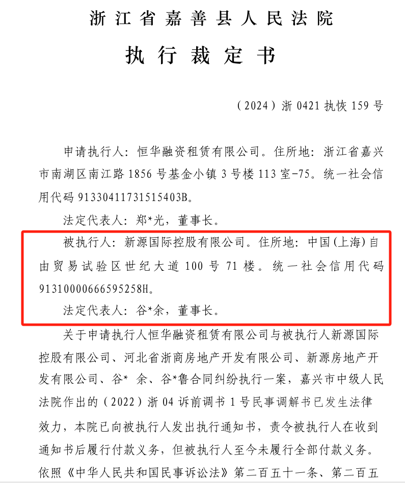 天眼查信息显示,新源国际控股有限公司为一家民营企业,是一家地产开发运营公司,事业体涉及房地产开发、商业运营、科创产业等,股东为两位自然人,2022年5月19日,嘉善县人民法院还对新源国际控股有限公司发布限制消费令,该公司被法院采取限制消费措施;去年7月,上海市浦东新区税务局还发布公告,新源国际控股有限公司欠税金额97.47万元。