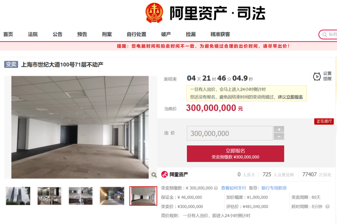 该网显示,上海市浦东新区世纪大道100号71层不动产在阿里司法公开变卖,变卖起始价3亿元。这是浙江省嘉善县人民法院于今年7月1日10时至8月30日10时期间,进行的公开变卖活动。