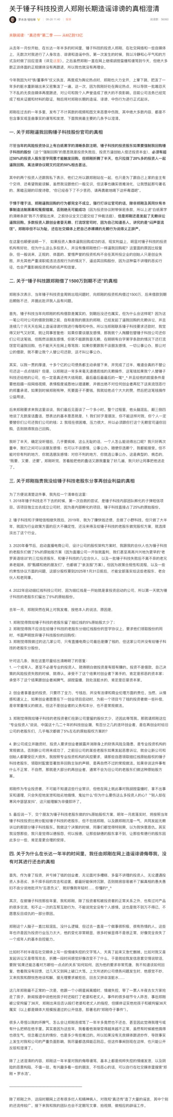 8月26日午间,罗永浩通过其个人微博发布《关于锤子科技投资人郑刚长期造谣诽谤的真相澄清》文章。文章透露,“目前公司法务已经完成了相关证据和材料的取证,稍后将对郑刚长期的造谣、诽谤、中伤行为进行正式起诉。”罗永浩表示,交个朋友为锤子科技老股东做的5%原始股权方案,明年一月底落实时,将按照当年锤子科技投资比例分配给锤子科技的老股东,“但不包括郑刚,以及跟郑刚沆瀣一气,共同发起无赖诉讼的那部分锤子科技股东”。