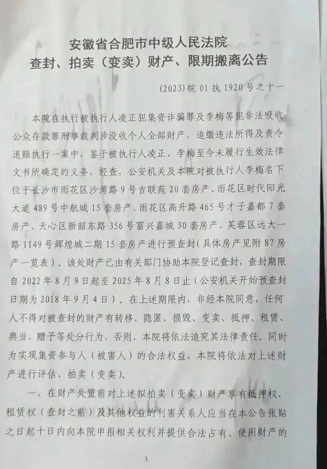网传视频截图显示,房屋门口贴有安徽省合肥市中级人民法院的封条以及查封、拍卖(变卖)财产、限期搬离公告。公告显示,合肥中院在执行被执行人凌正犯集资诈骗罪及李梅等犯非法