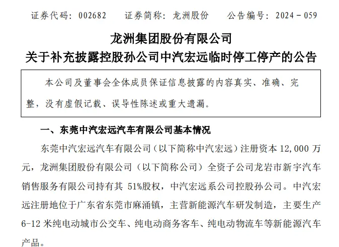龙洲股份(002682)8月23日晚间宣布,主要生产新能源大巴的控股孙公司东莞中汽宏远汽车有限公司(简称“中汽宏远”)自6月1日起延长停工停产至11月30日。龙洲股份强调,近年来,中汽宏远的营业收入占公司合并报表营业收入的比重非常小,此次停工停产对公司营业收入影响较小。