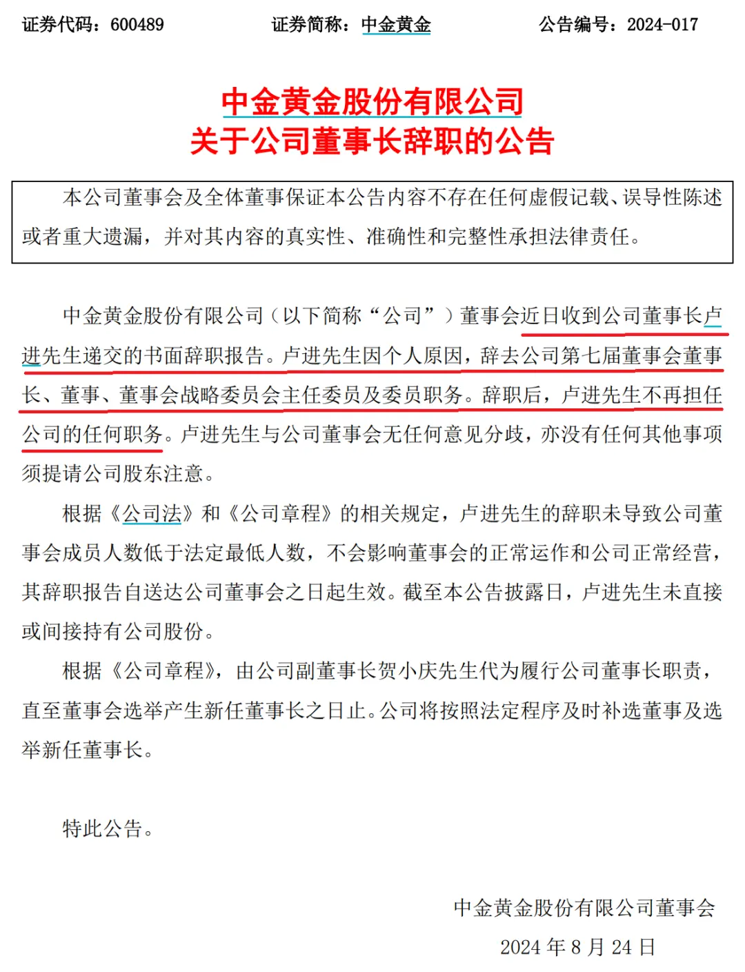 因个人原因,中金黄金董事长卢进辞去董事长、董事等职务。辞职后,卢进不再担任中金黄金的任何职务。