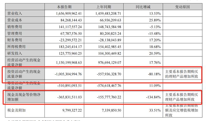 对于公司的投资活动产生的现金流量净额的明显变化,爱美客在半年报中表示:“主要系本报告期购买理财产品增加所致” 。
