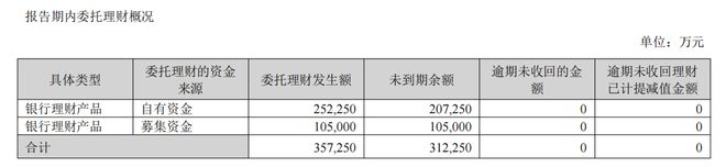 2024年上半年,该公司委托理财金额35.73亿元,均为银行银行理财产品。其中25.23亿来自自有资金,10.50亿元来自募集资金。