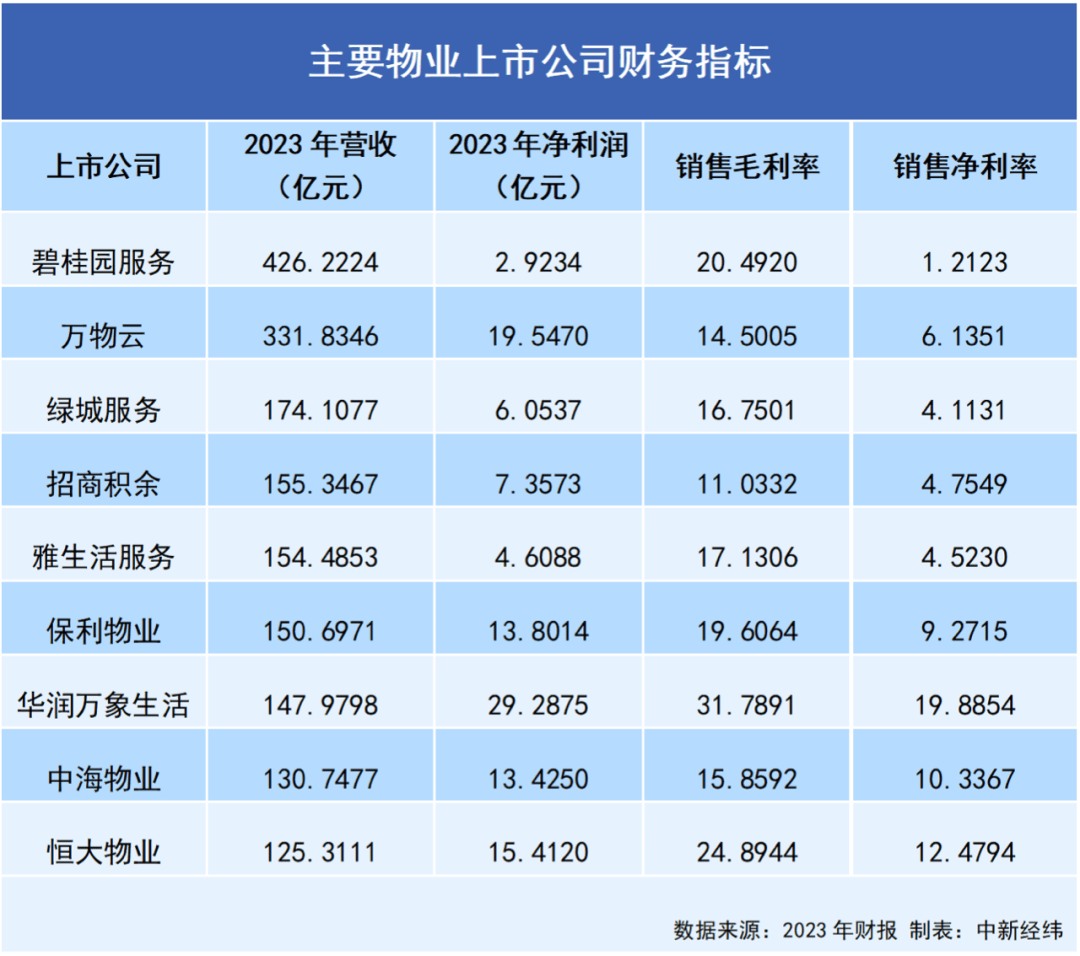 Wind数据显示,2023年,A股和港股共有9家物业公司营收超过百亿,分别为碧桂园服务、万物云、绿城服务、招商积余、雅生活服务、保利物业、华润万象生活、中海物业、恒大物业,其中碧桂园服务以426亿元领先,万物云332亿元位居第二。