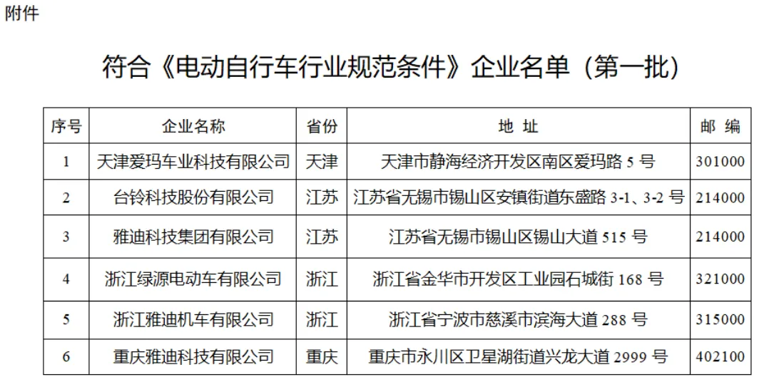 为加强电动自行车行业管理,推动我国电动自行车行业健康可持续发展,依据《电动自行车行业规范条件》(以下简称《规范条件》)和《电动自行车行业规范公告管理办法》,经企业申请、文件资料审核、现场查验、网上公示等程序,形成了第一批符合《规范条件》的企业名单,现予以公告。