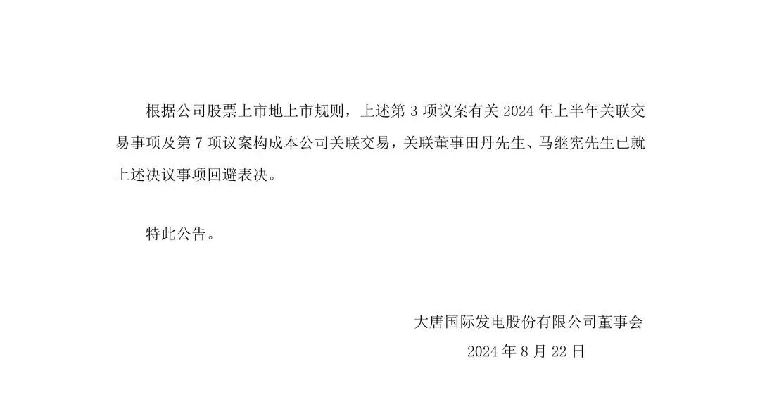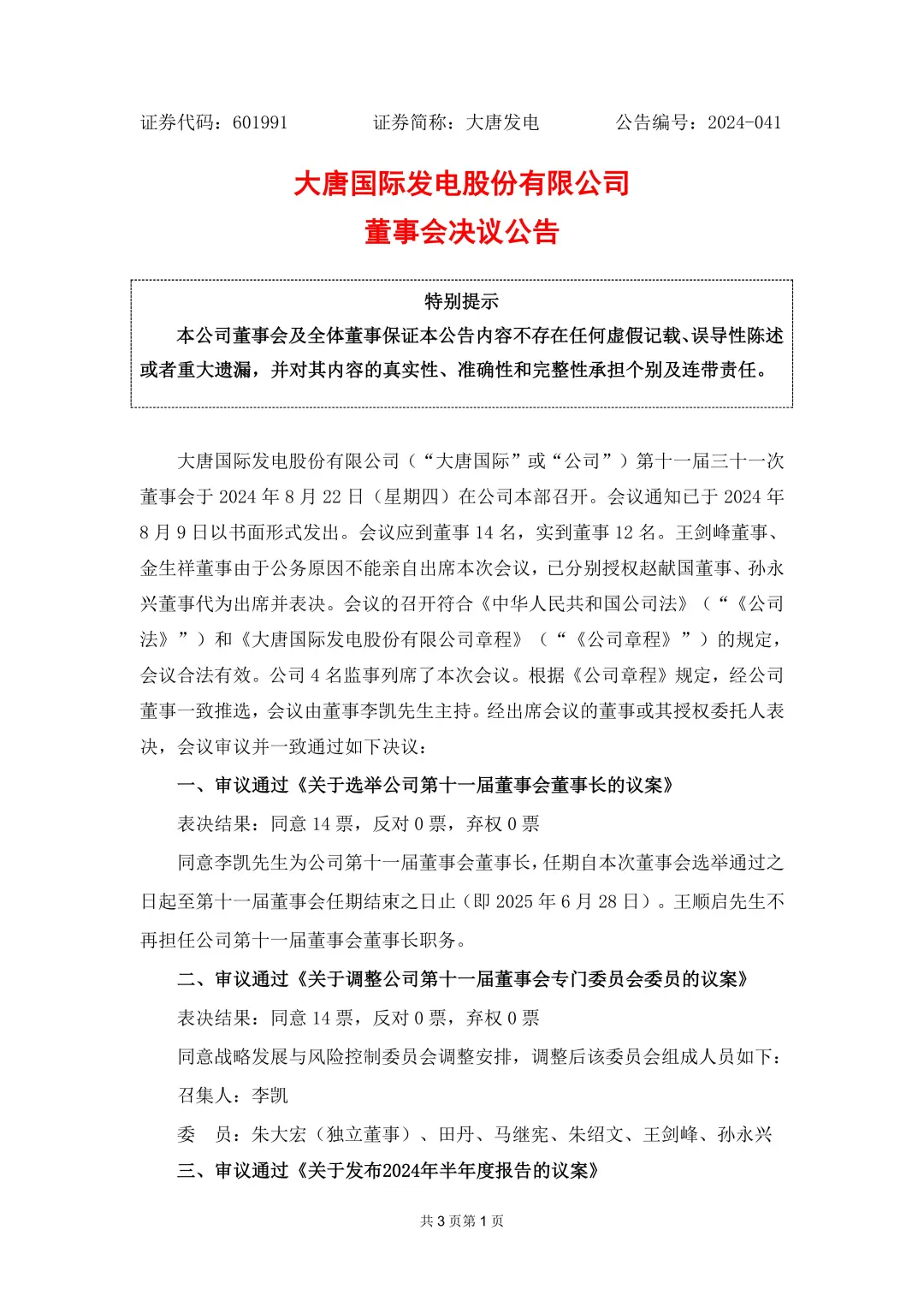 8月22日,大唐发电发布公告:董事会审议通过《关于选举公司第十一届董事会董事长的议案》,同意李凯先生为公司第十一届董事会董事长,任期自本次董事会选举通过之 日起至第十一届董事会任期结束之日止(即2025年6月28日)。王顺启先生不 再担任公司第十一届董事会董事长职务。