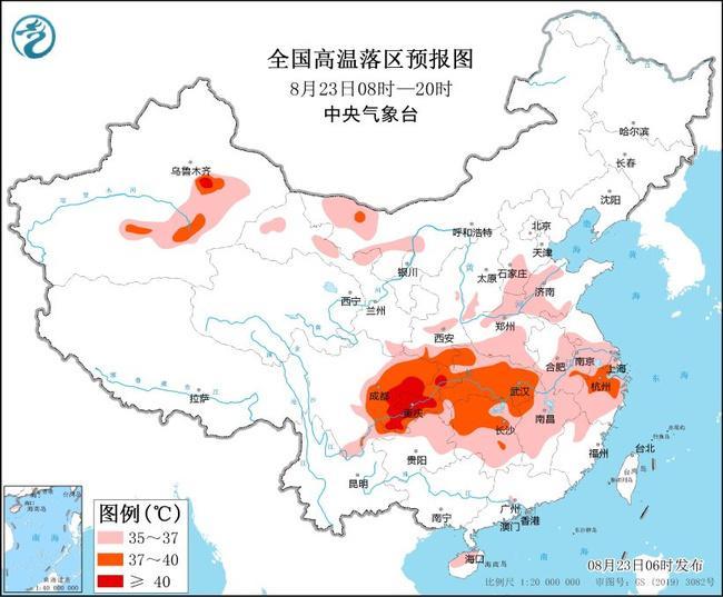 预计8月23日白天,四川盆地、重庆、湖北、湖南、浙江大部、安徽中南部、江苏中南部、上海大部、江西中北部、福建西北部、贵州北部、云南东北部、海南岛西北部以及新疆南疆盆地东部、甘肃河西、内蒙古西部、陕西中南部、山西南部、河北南部、山东北部和西部、河南大部等地有35℃以上高温天气,其中,四川盆地东部、重庆、陕西南部、湖北大部、湖南北部以及新疆南疆盆地东部等地部分地区最高气温37~39℃,局地可达40℃以上。