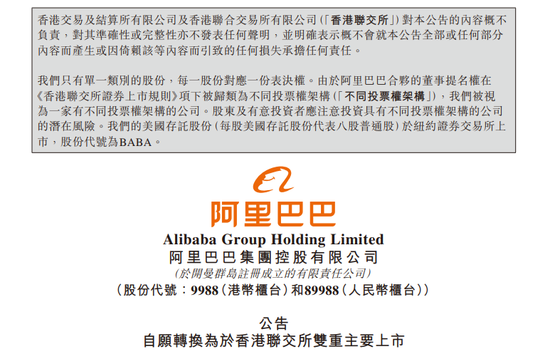 公告还显示,阿里巴巴在香港双重主要上市不涉及新股发行和融资。