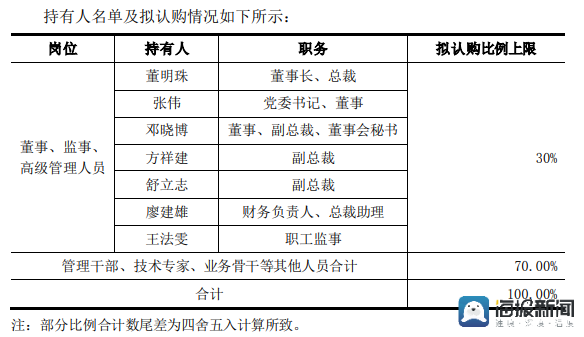 8月初,格力电器发布的第三期员工持股计划(草案)摘要显示,参与员工持股计划的格力电器董监高分别为董明珠、张伟、邓晓博、方祥建、舒立志、廖建雄和王法雯等7人。根据草案,董监高等高管团队可最高认购总规模的30%,管理干部、业务骨干等其他人员合计认购比例上限为70%。