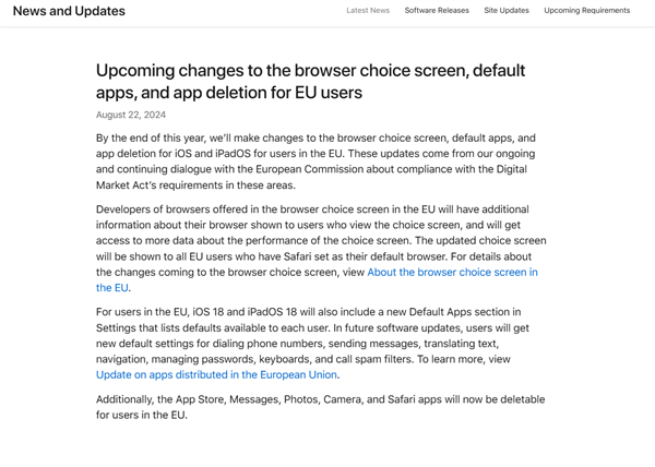 日前,苹果宣布,将在今年年底前将对iOS、iPadOS进行调整,将为欧盟用户提供浏览器等更多默认应用更改选项,并允许iPhone和iPad用户删除预装的系统App。