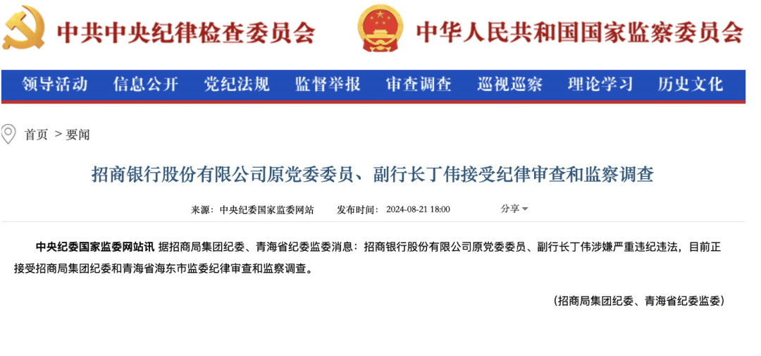 中央纪委国家监委网站8月21日通报,据招商局集团纪委、青海省纪委监委消息:招商银行股份有限公司原党委委员、副行长丁伟涉嫌严重违纪违法,目前正接受招商局集团纪委和青海省海东市监委纪律审查和监察调查。