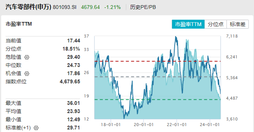 今年以来,汽车零部件板块跌幅达20.59%,整体估值进一步降低。复盘汽车零部件2017年以来的走势,当前估值正处于历史低位。