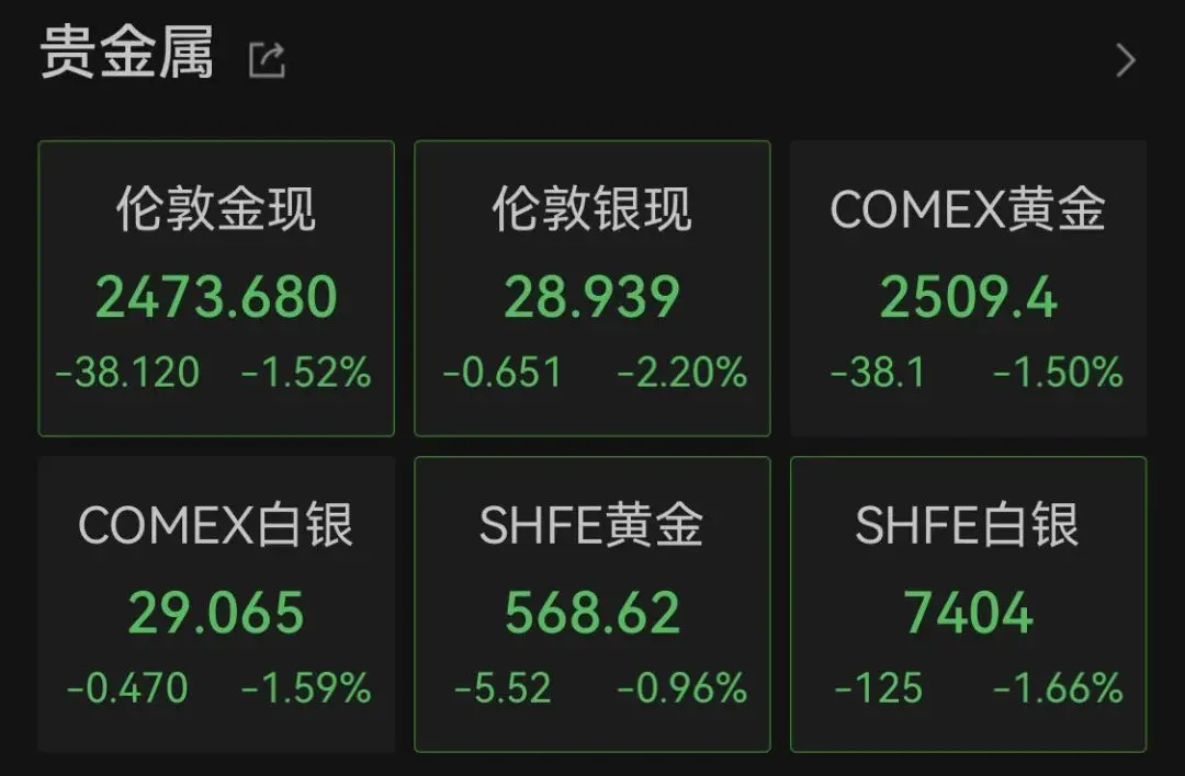 国内方面,贵金属期货短线跳水,沪银主力合约跌幅超1%,报7447元/千克;沪金主力合约跌幅近1%,报568.82元/克。