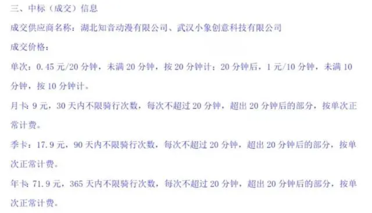 天眼查信息显示,《武汉大学共享电动自行车服务项目磋商公告》(招标编号:HBT-13124192-244229)的发布时间是2024年7月19日,开标时间2024年7月31日09时30分。7月31日,当日发布的《武汉大学共享电动自行车服务项目成交结果公告》显示,前述公司中标。