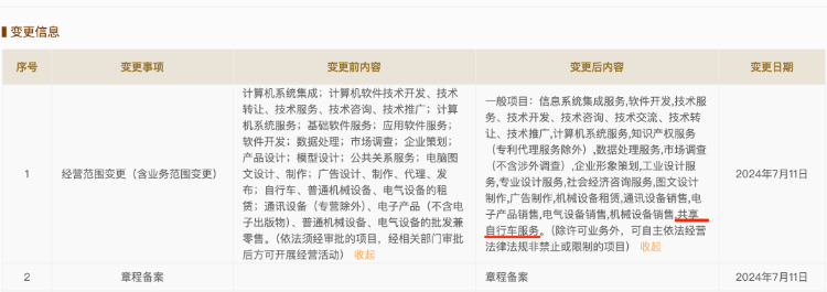 记者注意到,在2024年7月11日,该公司经营范围发生变更,业务范围新增了“共享自行车服务”。