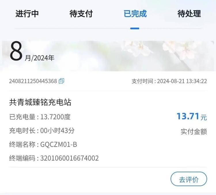 8月22日下午,发帖男子发布进展,称车子是混动的车,电池小,后续是联系到官方,说是程序乱码,实际只扣了13.71元,“肾、车、房都还在”。他公布的这笔订单的页面显示,当天共充了13.72度电,充电时长43分,实付金额13.71元。“云快充官方打电话给我,说已经安排人员去维修调试了。”
