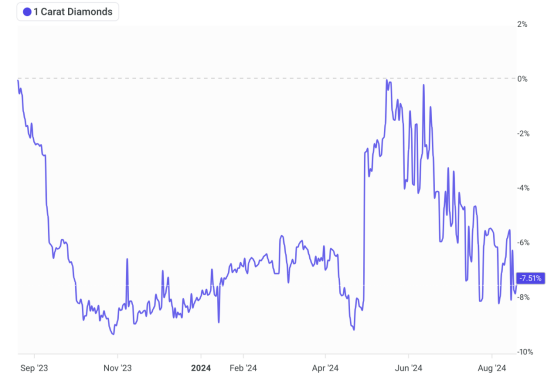 (1克拉钻石平均价格12个月涨跌幅走势。来源:stonealgo)