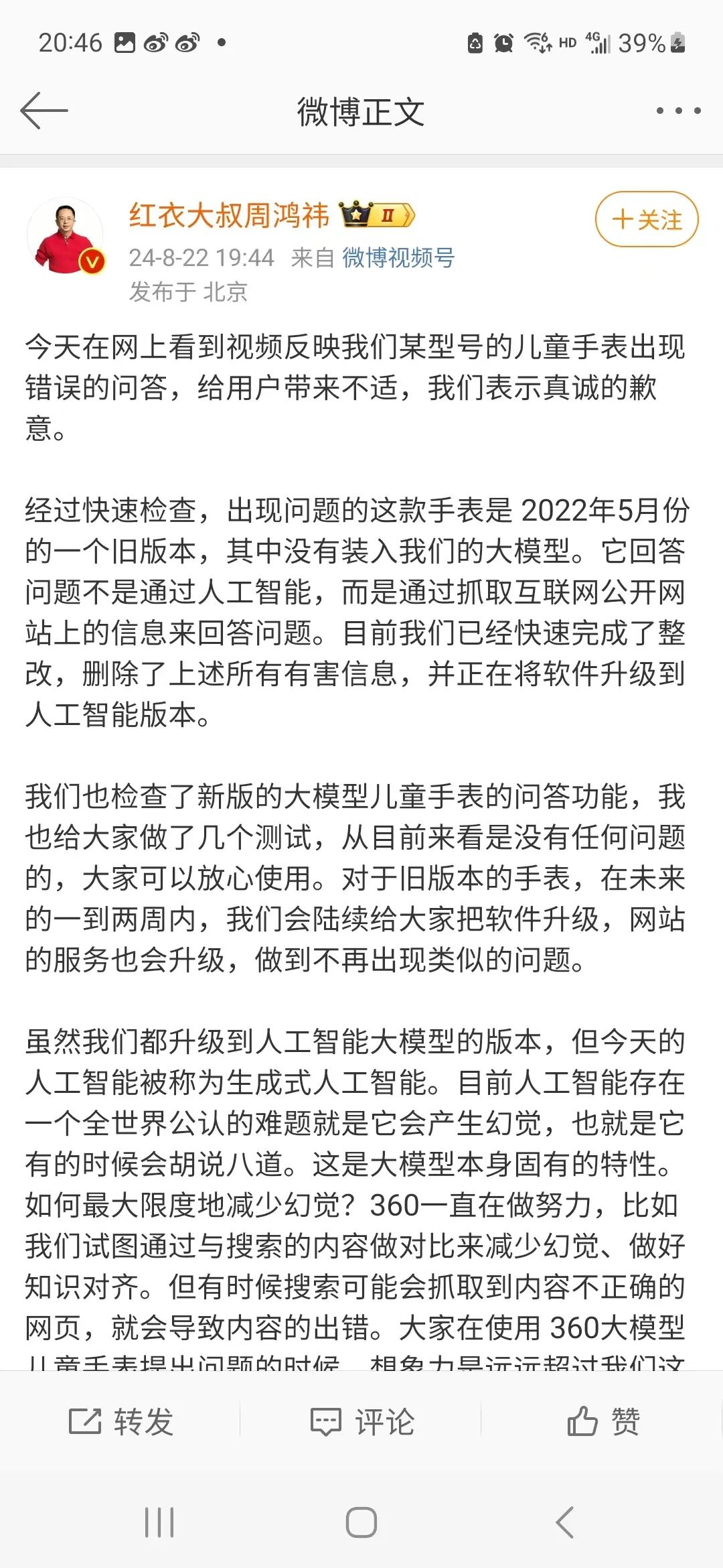 8月22日晚,360集团创始人、董事长周鸿祎在微博发文就360儿童手表答疑时出现争议言论道歉。周鸿祎表示,经过快速检查,出现问题的这款手表是2022年5月份的一个旧版本,其中没有装入公司的大模型。它回答问题不是通过人工智能,而是通过抓取互联网公开网站上的信息来回答问题。目前公司已经快速完成了整改,删除了上述所有有害信息,并正在将软件升级到人工智能版本。