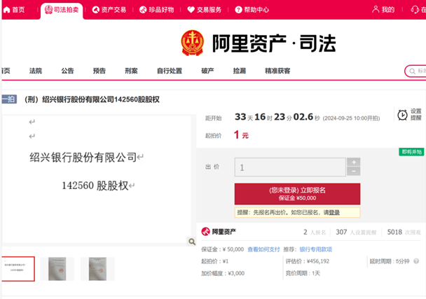 “基本上,能被1元起拍的银行股权都为涉刑资产。这笔绍兴银行股权就是被查封的自然人股权,查封期限是2023年9月至2026年9月。有意者需亲自与绍兴银行或监管部门核实自身是否符合入股条件。因不符合竞买资格而竞得的,将依法进行悔拍处理。”相关负责人告诉记者。