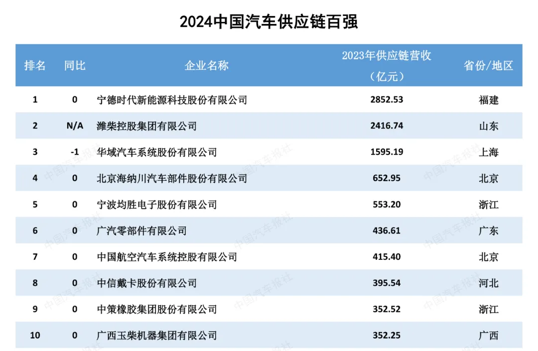 2024“中国汽车供应链百强”排名前十位的企业分别是宁德时代、潍柴集团、华域汽车、海纳川、均胜电子、广汽部件、中航汽车系统、中信戴卡、中策橡胶和广西玉柴,覆盖了动力电池、传统动力、汽车电子、轮胎、轮毂以及综合性零部件企业。