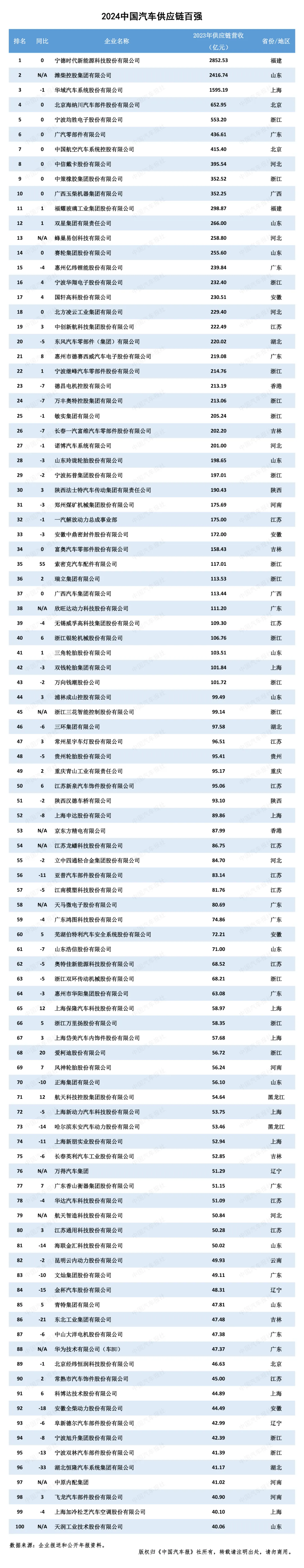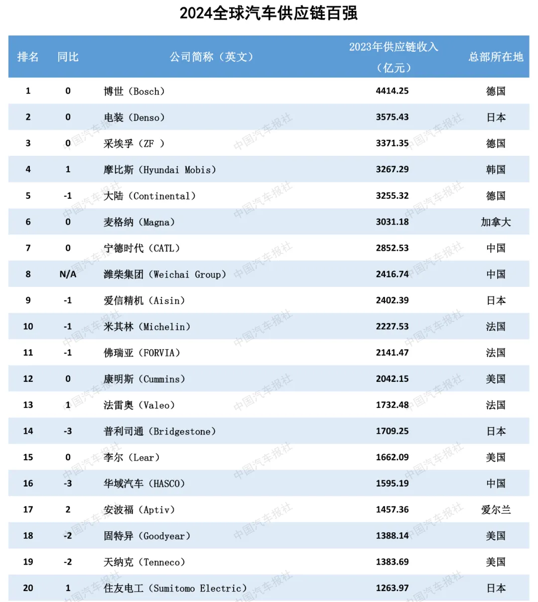 2024“全球汽车供应链百强”中,有三家中国企业进入前二十,分别是宁德时代、潍柴集团和华域汽车,这代表着中国零部件企业的深厚积累与创新能力,也向世界展示了中国企业在全球汽车供应链中不可或缺的角色和地位。