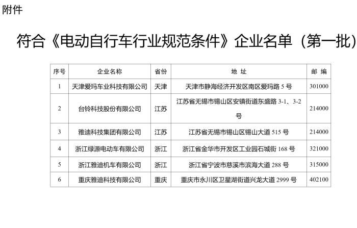 8月22日,工信部公布第一批符合《电动自行车行业规范条件》企业名单,6家企业上榜,分别是:天津爱玛车业科技有限公司、台铃科技股份有限公司、雅迪科技集团有限公司、浙江绿源电动车有限公司、浙江雅迪机车有限公司、重庆雅迪科技有限公司。